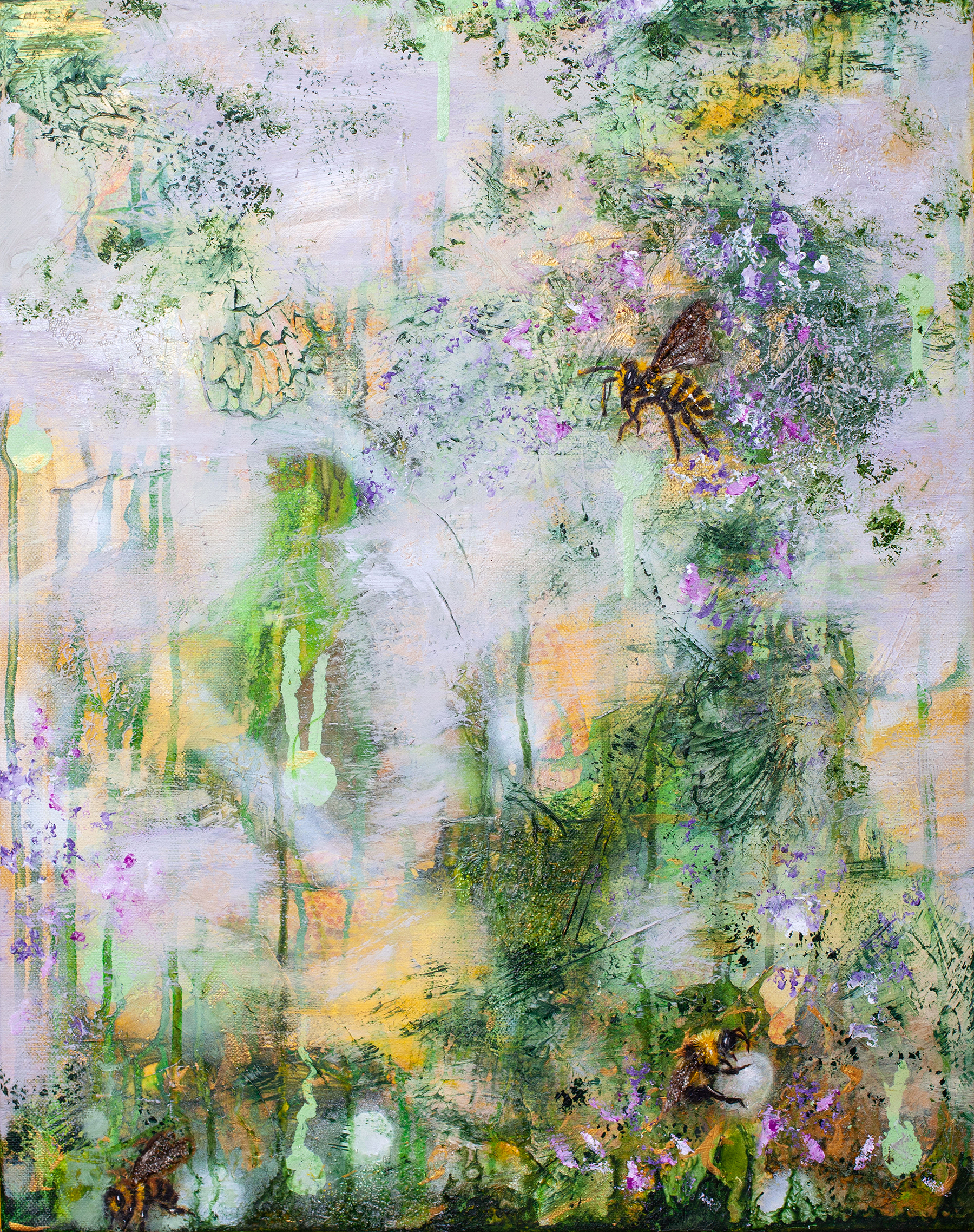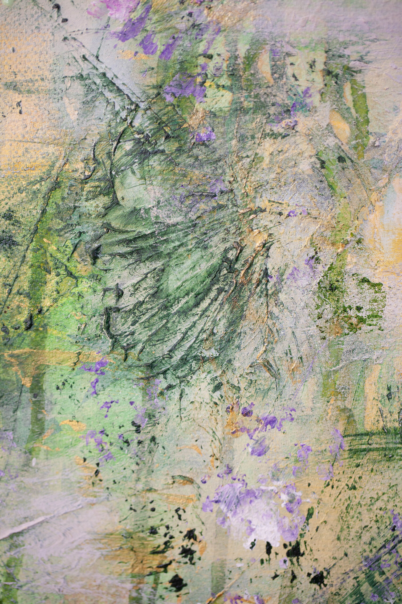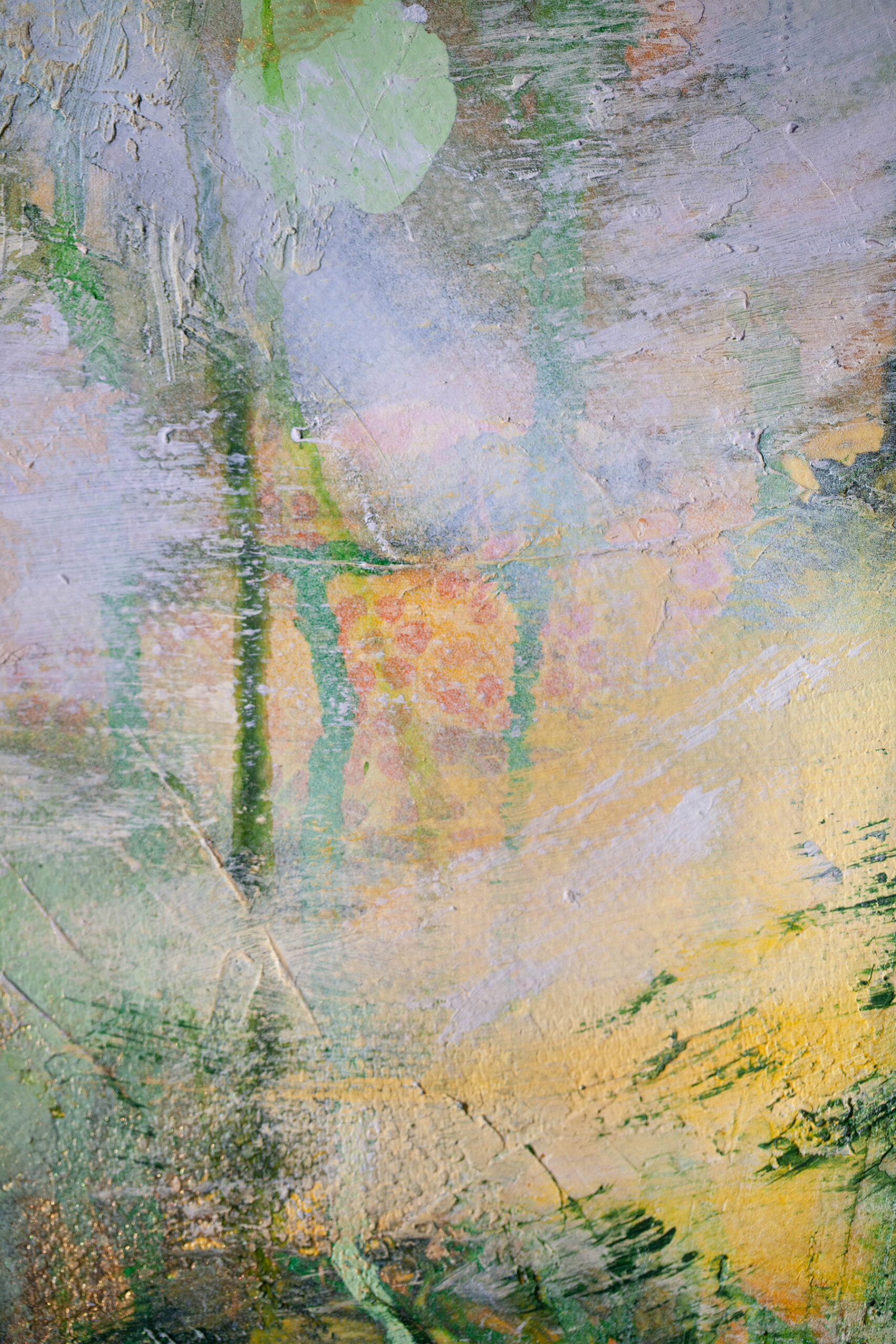 This painting evokes joy of creation and the quiet pleasure of existence. In this ethereal dance of green, yellow and violet you can find a lazy summer melody, suspended in delicate and dreamlike world. There is no rush here. Only presence.